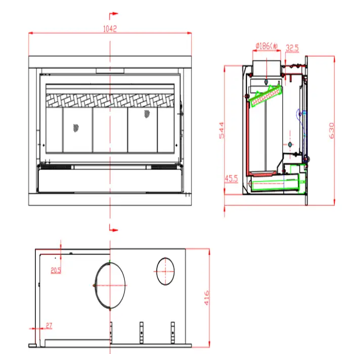 The dimensions of the stove heater are 565mm x 1012mm x 416mm.