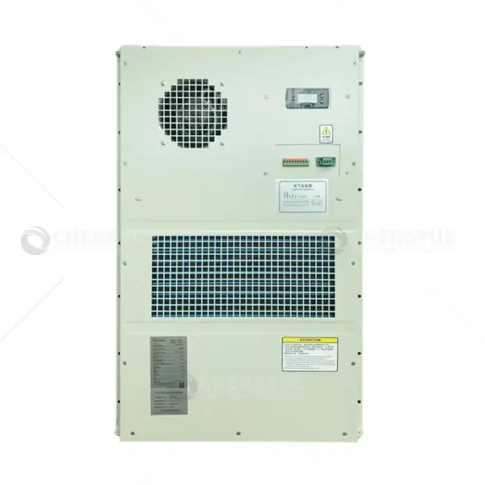 The air conditioner has a compact panel design that fits seamlessly into various outdoor cabinets, saving space while providing effective cooling.