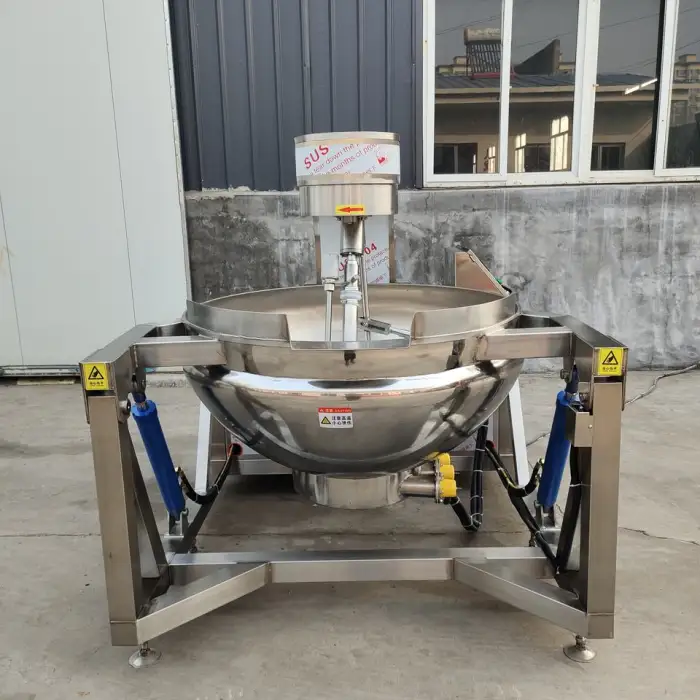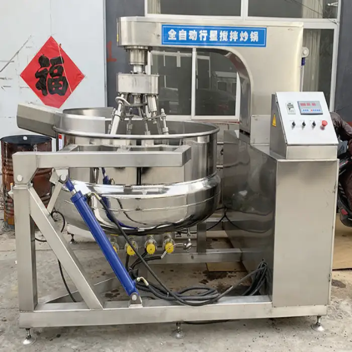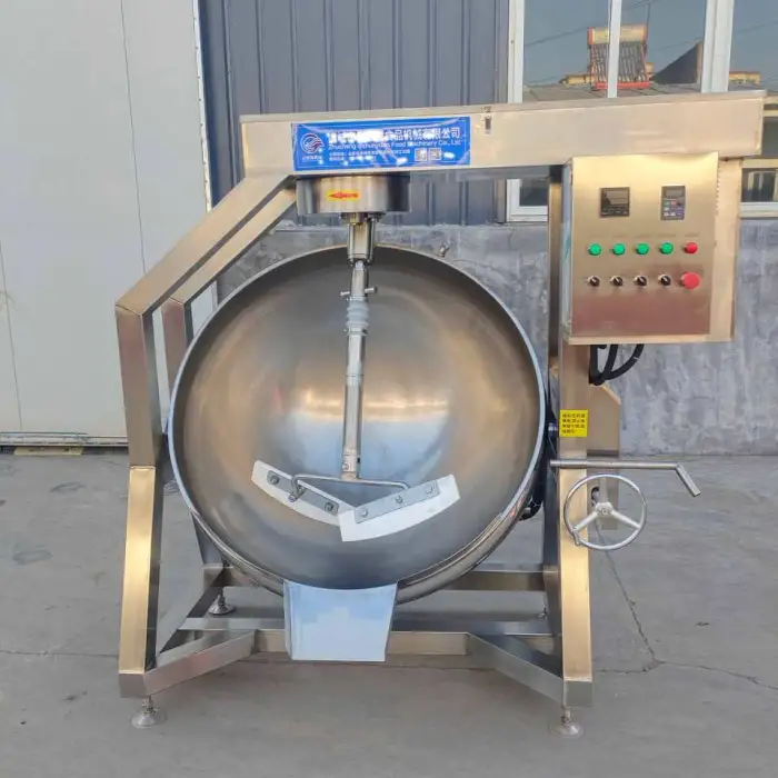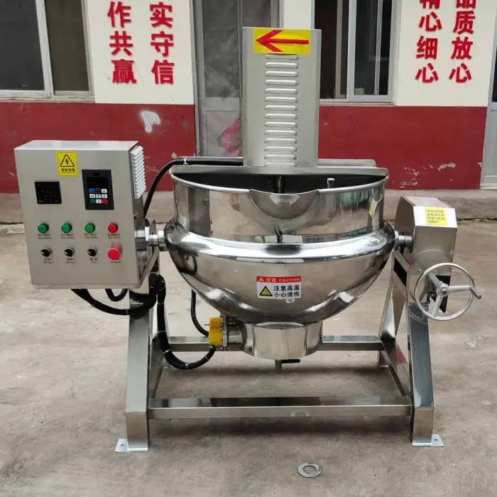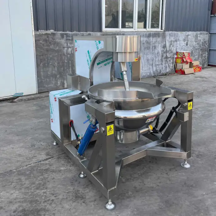 The machine is designed for easy operation, equipped with intuitive controls for heating, stirring, and tilting functions.