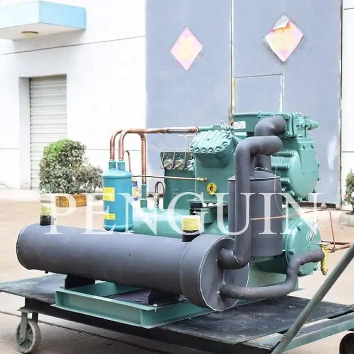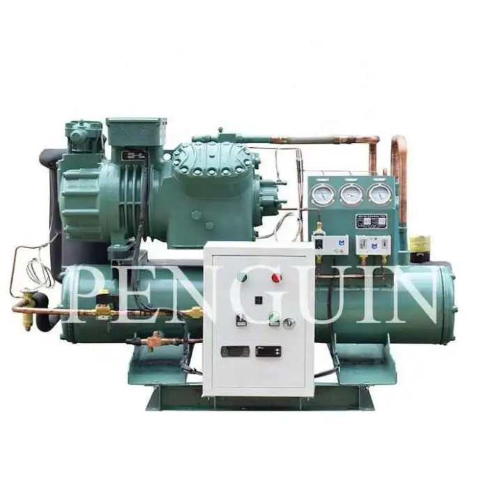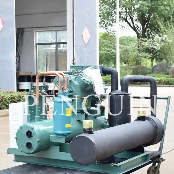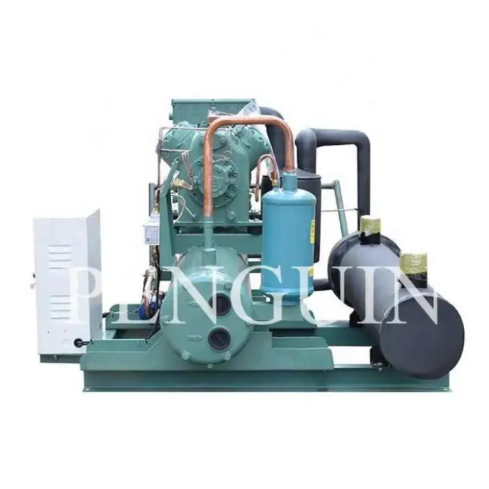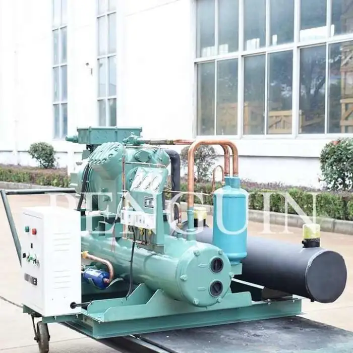 The Industrial Freezer Unit uses a water-cooled condenser for efficient heat dissipation.