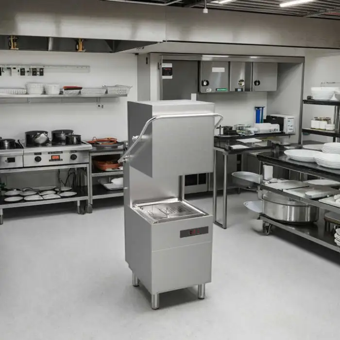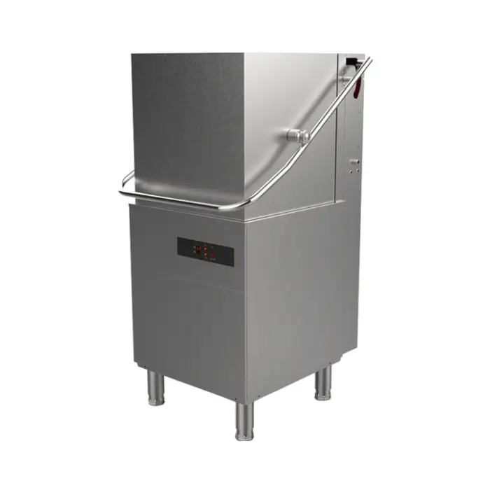 The machine features high efficiency for fast cleaning, easy operation with simple controls, and is designed to handle the heavy demands of a commercial kitchen.