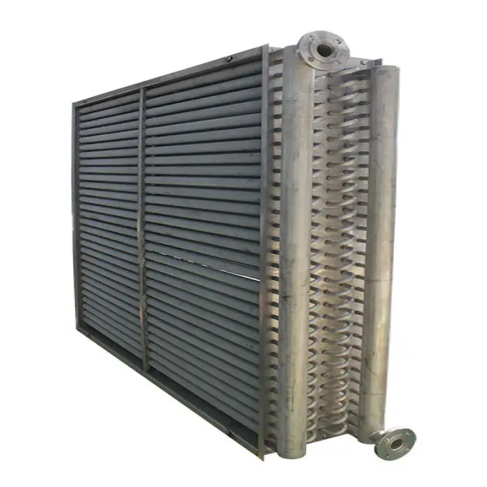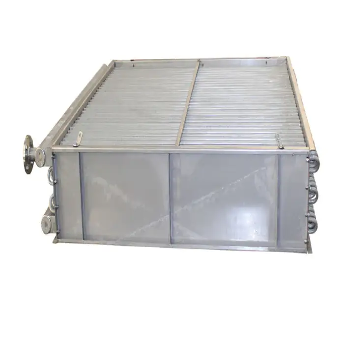 The heat exchanger features a durable frame made of SS304 stainless steel and utilizes finned tube technology for effective heat transfer.