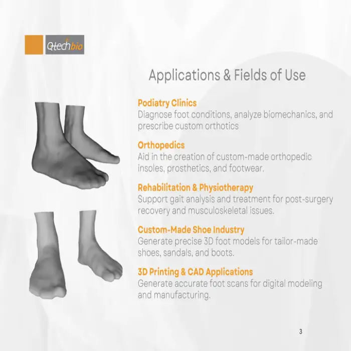 A modern all-digital measurement system that creates a 3D model of the feet to generate precise measurements used to design customized corrective insoles for improved comfort and support.
