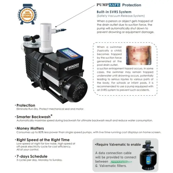 The key safety feature is the built-in SVRS Safe Protection system, which helps prevent drowning by shutting off the pump when it detects an obstruction.
