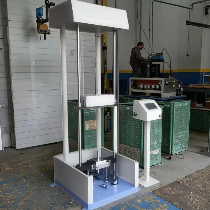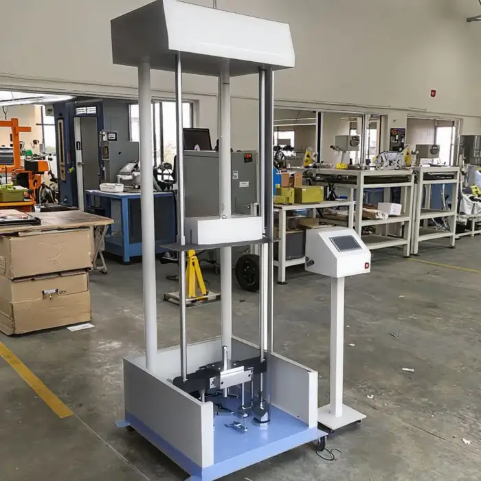 The testing machine is designed for easy operation, featuring a clear display and straightforward controls.