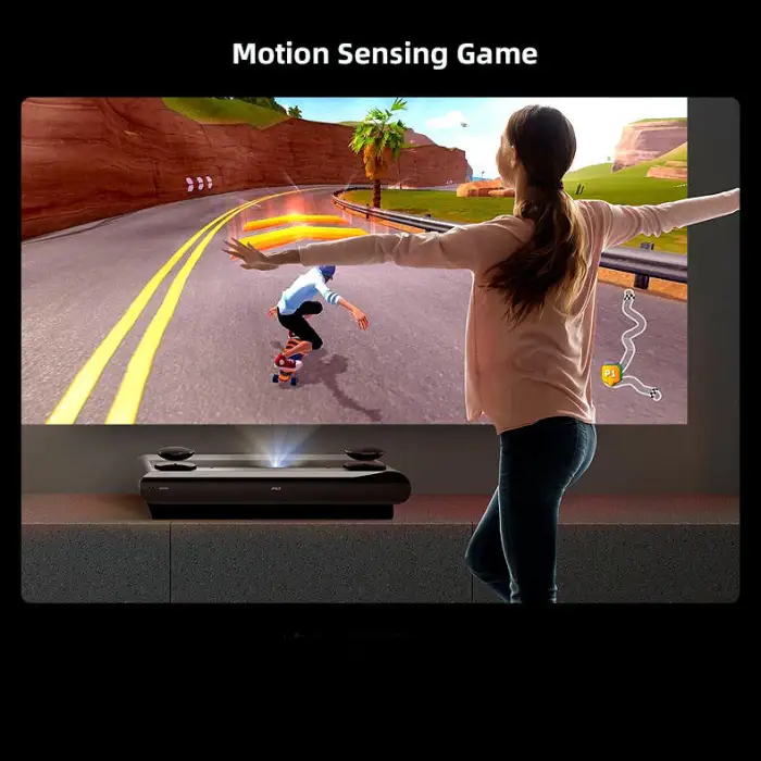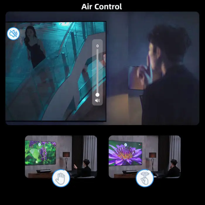 Gesture control lets you navigate the UI using hand movements in front of the projector's sensor. Exact gestures (swipe, select, back, etc.) and how to enable/disable the feature are described in the user manual.