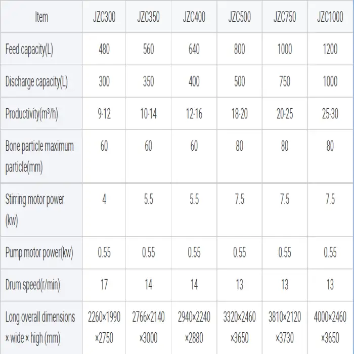 The JZC350 has a charging capacity of 480-1200L and a reclaiming capacity of 300L-1000L.