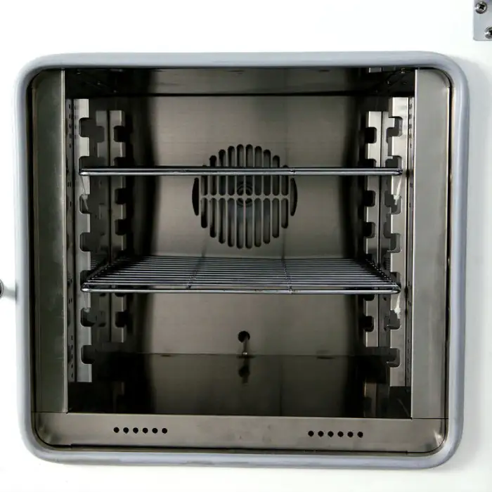 The oven uses forced convection to ensure uniform heat distribution, which allows for efficient and even drying.