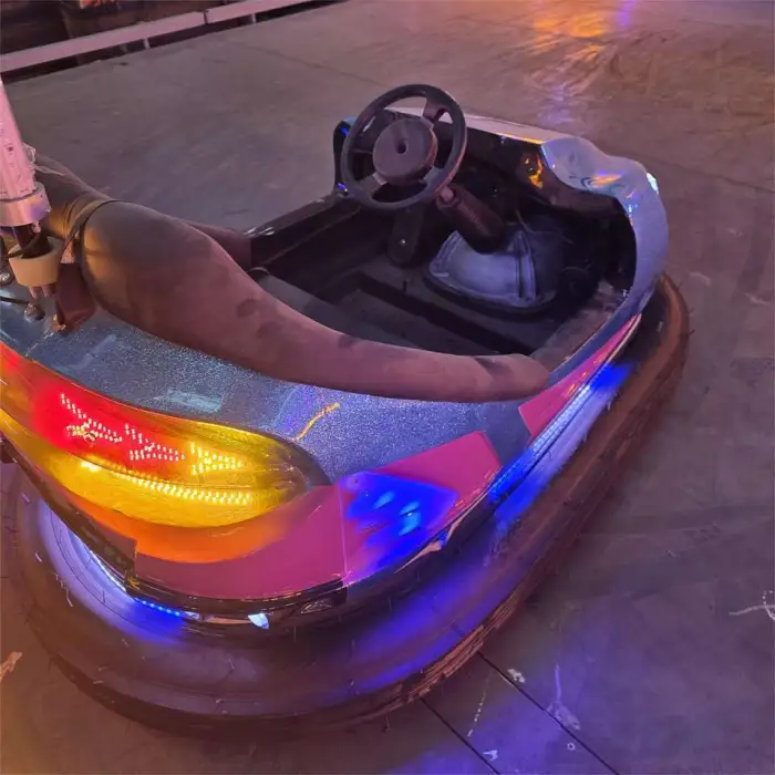 The bumper car is made of durable fiberglass and hardware, ensuring longevity and safety during use.