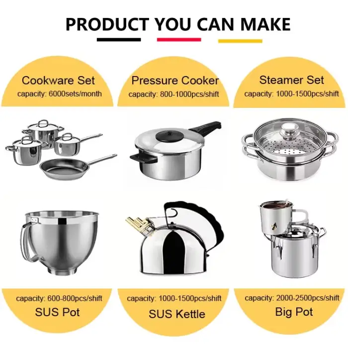The machine is designed to work with aluminum and stainless steel, allowing you to produce a variety of cookware items such as pots, plates, and spoons.