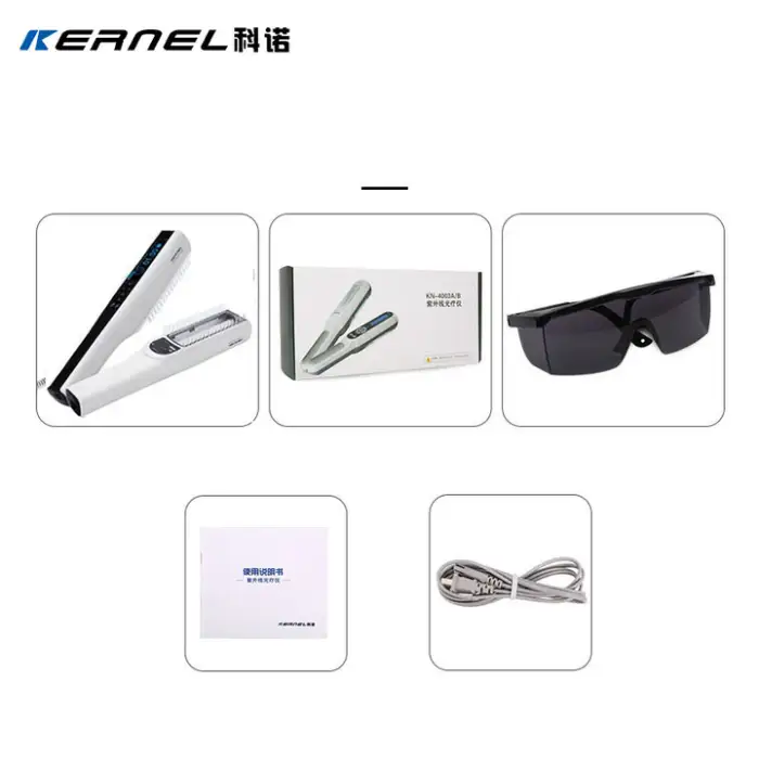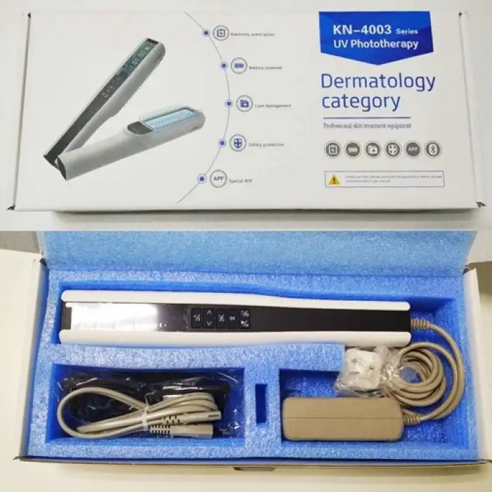 The KN-4003BL2 is a handheld narrow-band UVB phototherapy device that emits 311 nm light for at-home treatment of skin conditions such as vitiligo and psoriasis. It is designed to deliver targeted, controlled UVB exposures in a portable format.