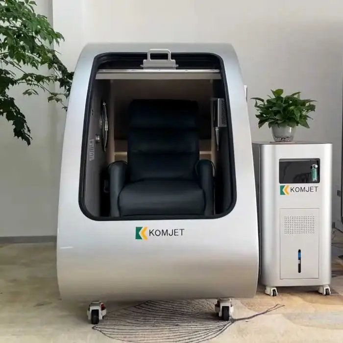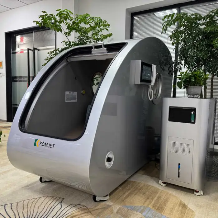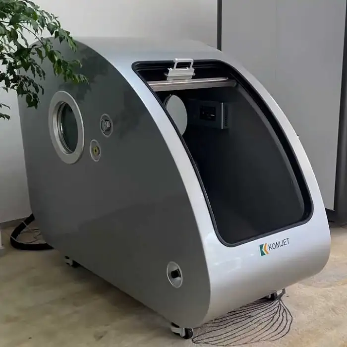 The KOMJET HBOT is a hard-shell hyperbaric oxygen therapy chamber designed for one person. It delivers high-pressure oxygen therapy (1.5–2.0 ATA) in a sitting, standing or lying configuration for home, clinic, gym or healthcare use.