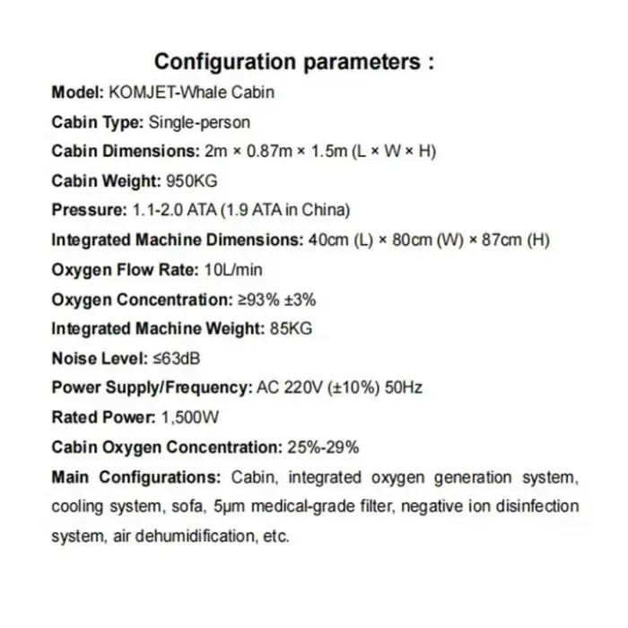 Capacity: 1 person. Pressure range: 1.5–2.0 ATA. Oxygen flow rate: 10 L/min. Oxygen concentration: approximately 95%. Cabin and shell material: low carbon alloy steel. Area covered: 2.6 m².