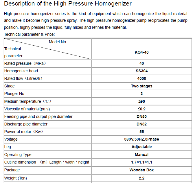The KQ 4 40 High Pressure Homogenizer can achieve a maximum pressure of up to 40 MPa (400 bar).