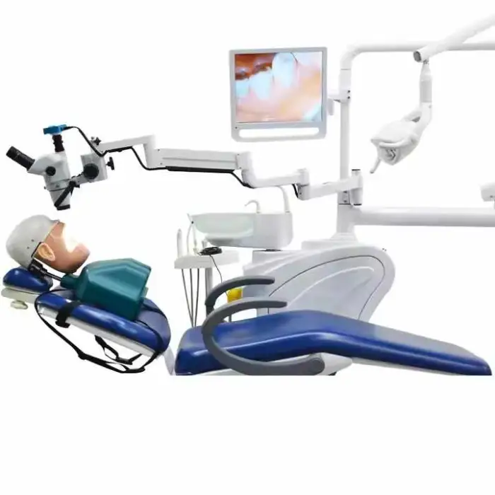 The listing notes that the microscope includes a photo camera and various accessories for oral therapy. For a complete accessory list (mounting hardware, adapters, covers, cables, etc.), request the detailed packing list from the seller.