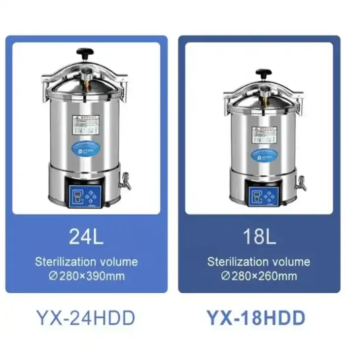 The IKEME Portable Pressure Steam Sterilizer is available in two capacities: 18 liters and 24 liters.