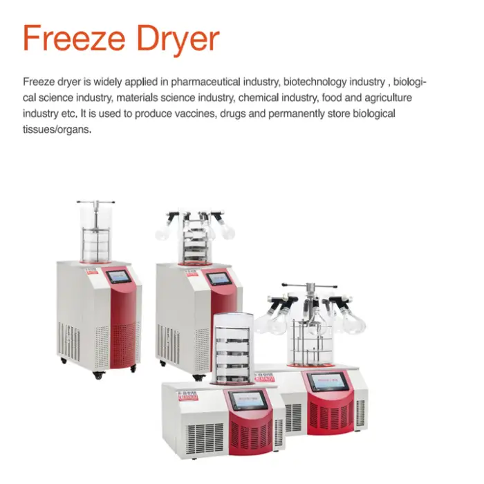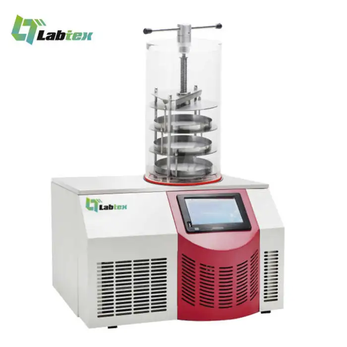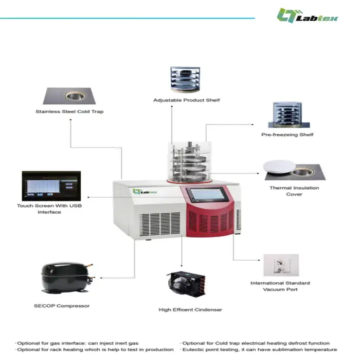 The LABTEX 9L is a compact freeze dryer designed for home and laboratory use to remove water from foods and other materials by freezing and sublimation. Typical uses include preserving fruits, vegetables, pet food, creating long-term food storage, producing snacks, and small-scale R&D work.