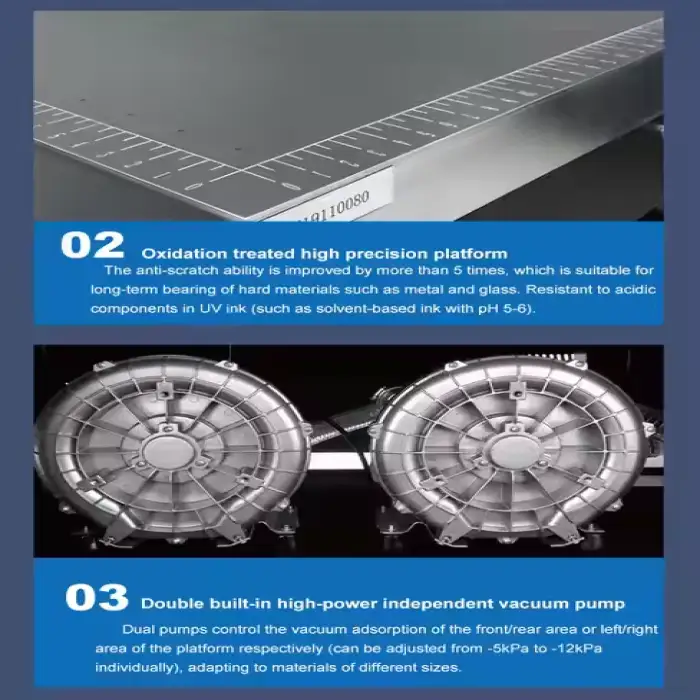 The I3200U print head offers print speeds of 10 m²/h at 4pass and 8 m²/h at 6pass. The Ricoh G6 print head achieves speeds of 18 m²/h at 4pass and 12 m²/h at 6pass.