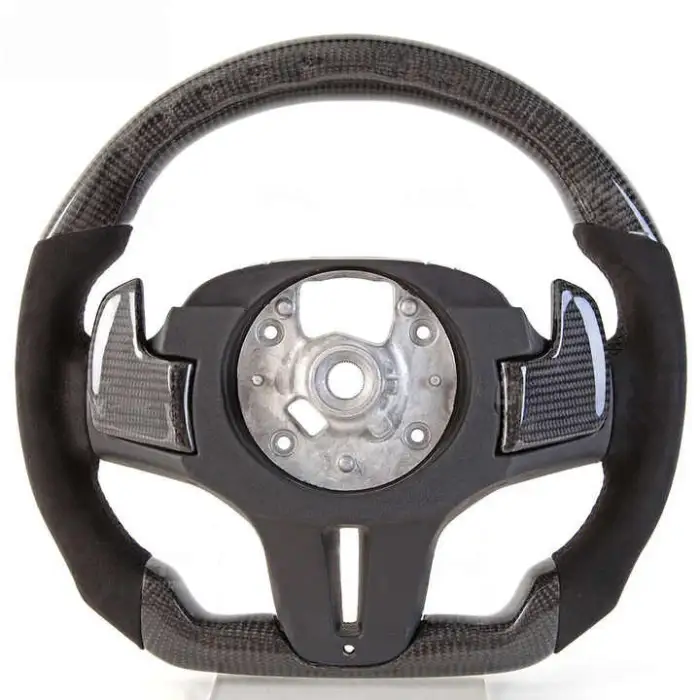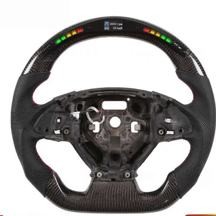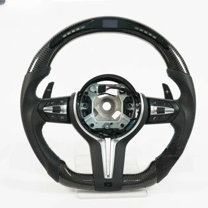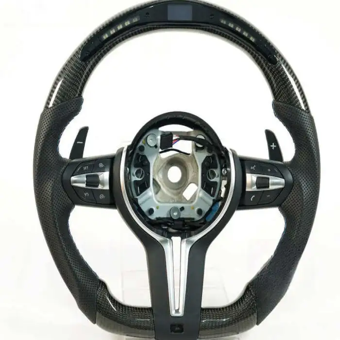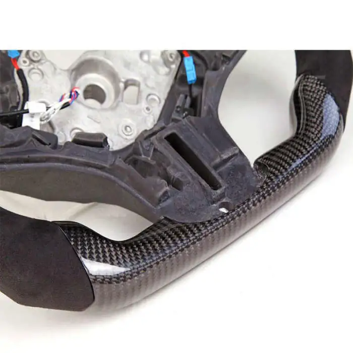 The steering wheel is made from high-quality leather and features a carbon fiber pattern for a stylish look and durable performance.