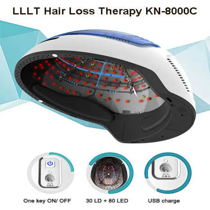 The KN-8000C is a low-level laser therapy (LLLT) cap with 272 diode lasers designed to promote hair regrowth, improve scalp health, and be used easily at home.