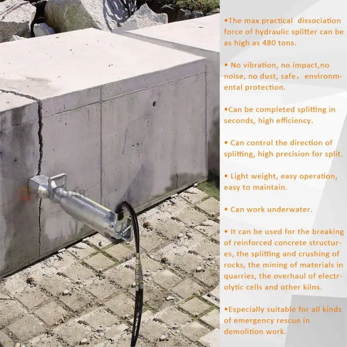 The stone splitter is ideal for construction sites, landscaping projects, emergency rescues, quarrying, mining operations, and stone masonry work.