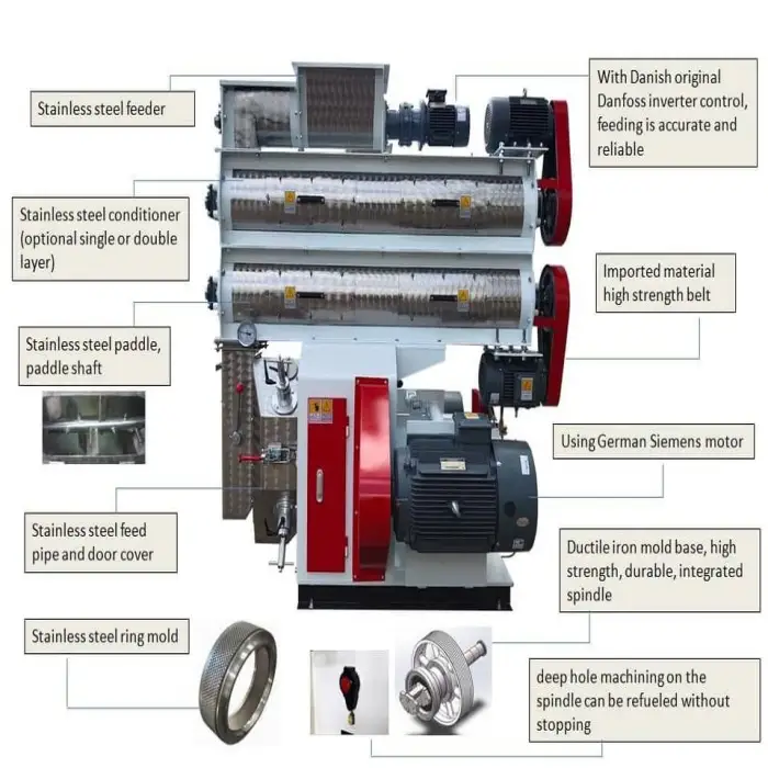This machine can produce feed pellets for poultry, pigs, and cattle, allowing for versatile feeding options on your farm.