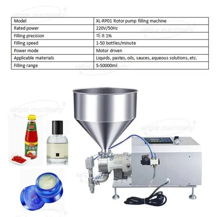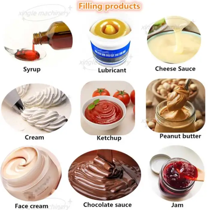It is best suited for filling jars and bottles with tomato sauce, peanut butter, shampoo, and other liquid or thick products in food packaging, cosmetics, and chemicals.