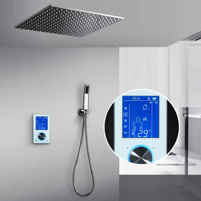 The shower set uses a button switch thermostatic valve for easy temperature control.
