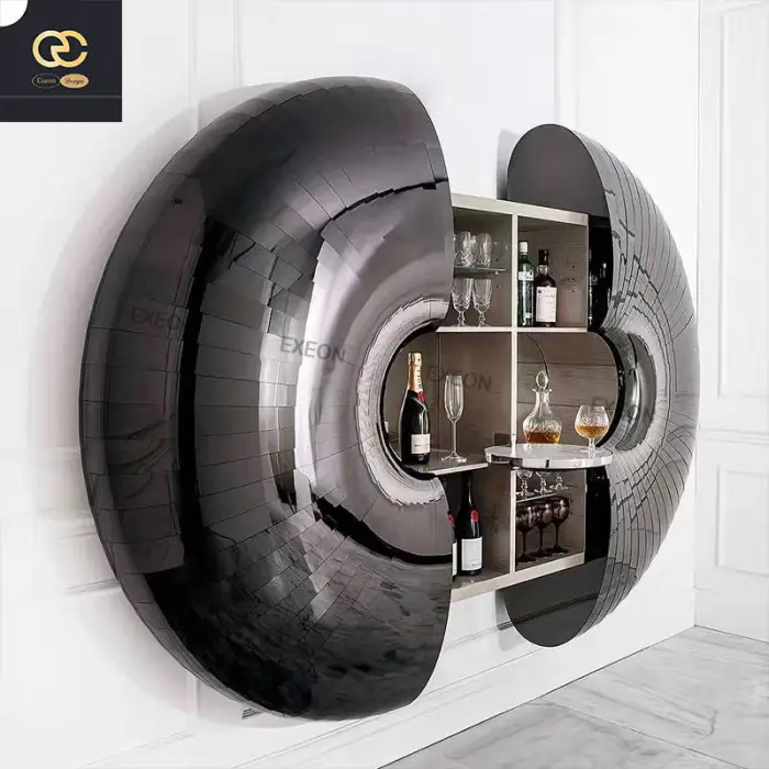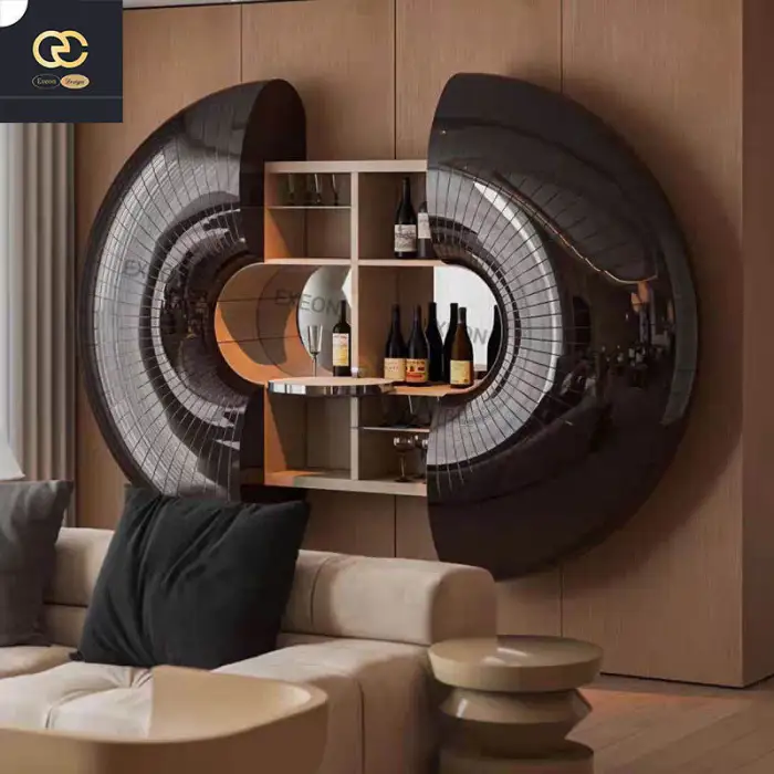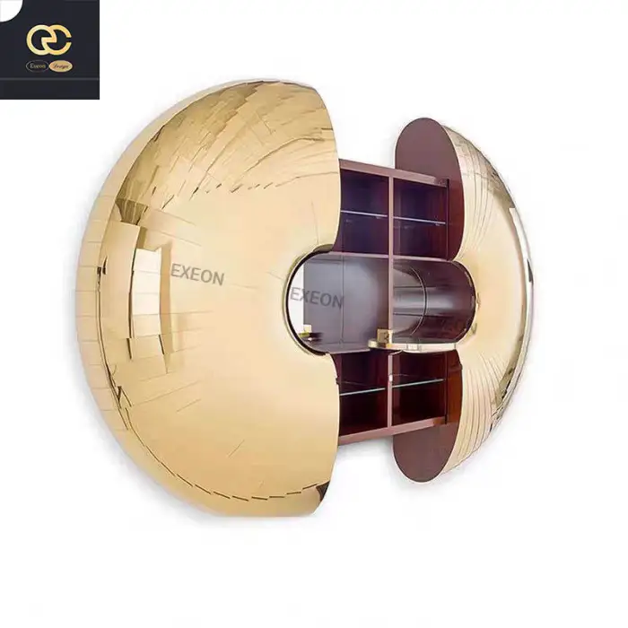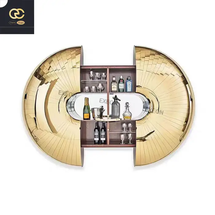 Luxurious Italian High-end Golden Art Living Room Furniture, Wall Stainless Steel Retractable Wine Cabinet