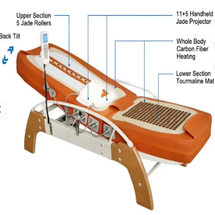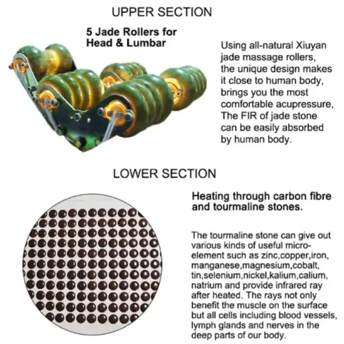 The 5 warm jade rollers provide targeted rolling massage along the spine and key areas while the carbon-fiber whole-body heating and heated tourmaline mattress deliver soothing warmth and far-infrared therapy. Using rollers with heat can enhance muscle relaxation and circulation.