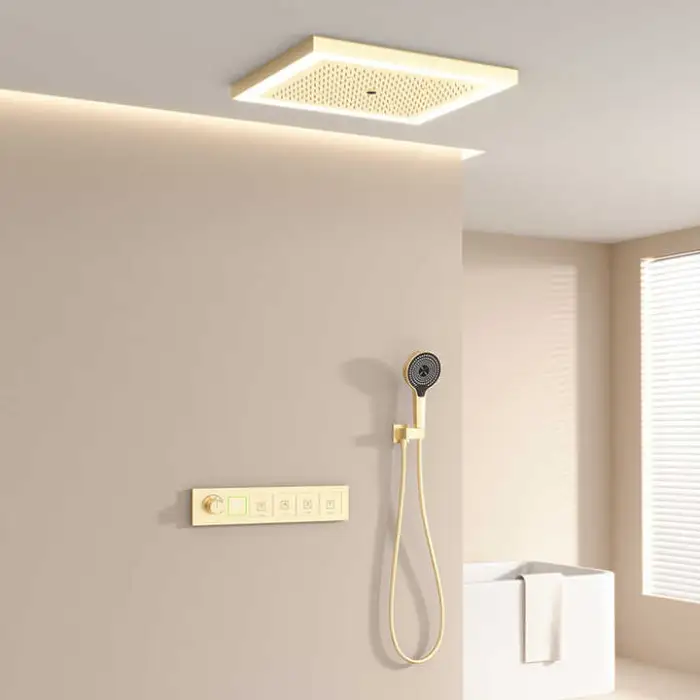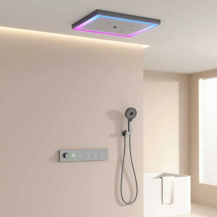 The shower set features a thermostatic faucet for constant water temperature, multiple spray patterns including rain and massage, easy installation, and maintenance.