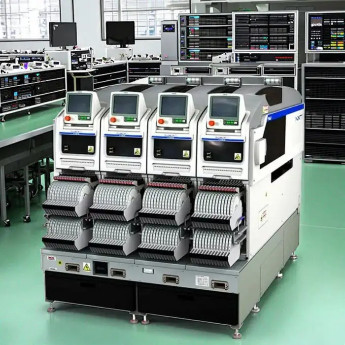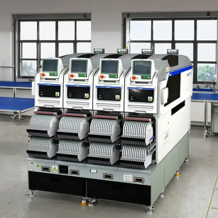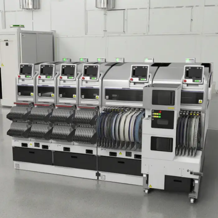 The machine is designed for high-speed performance, allowing for rapid production rates in PCB assembly.