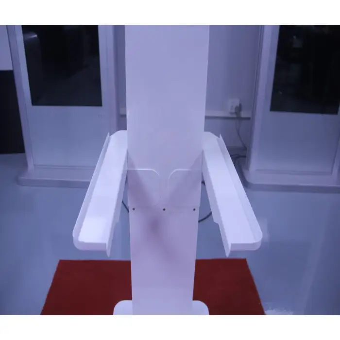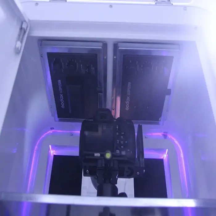 The photo booth features a durable metal frame designed to withstand regular use and ensure longevity.