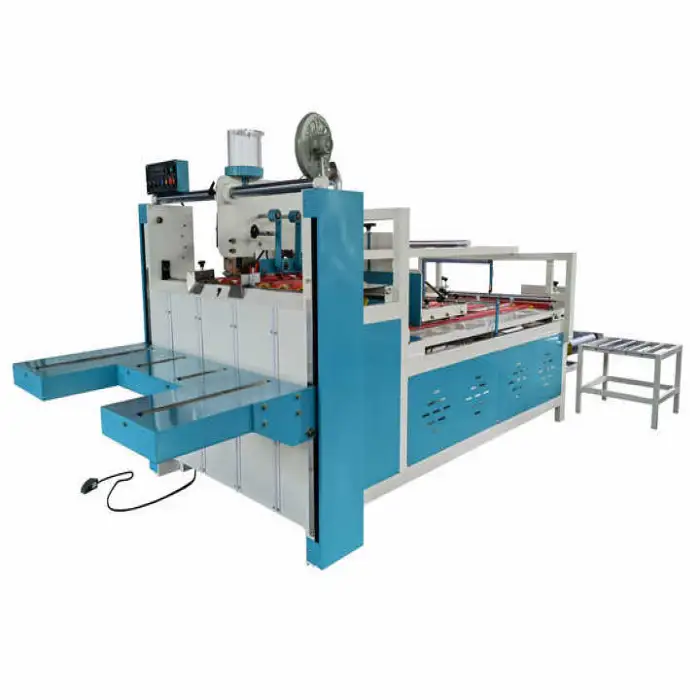 The machine is designed for gluing small boxes, making it suitable for various applications, including food packaging, beverage cartons, commodity boxes, chemical product packaging, and apparel and textile boxes.