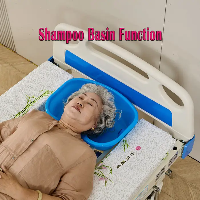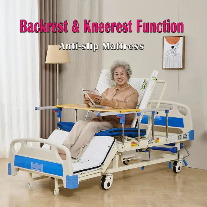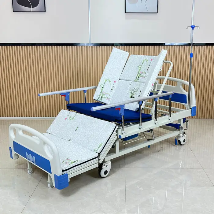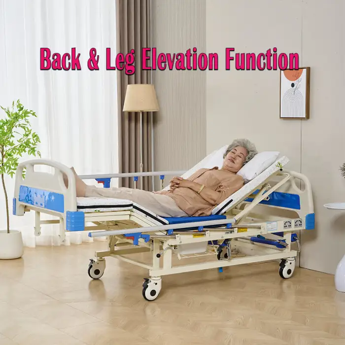 The bed allows for manual adjustments, including back rest and knee rest, providing comfort and support for patients.