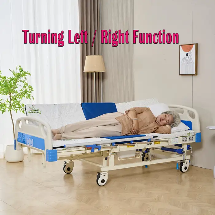 The bed is manually operated, allowing for easy adjustments by caregivers or patients.