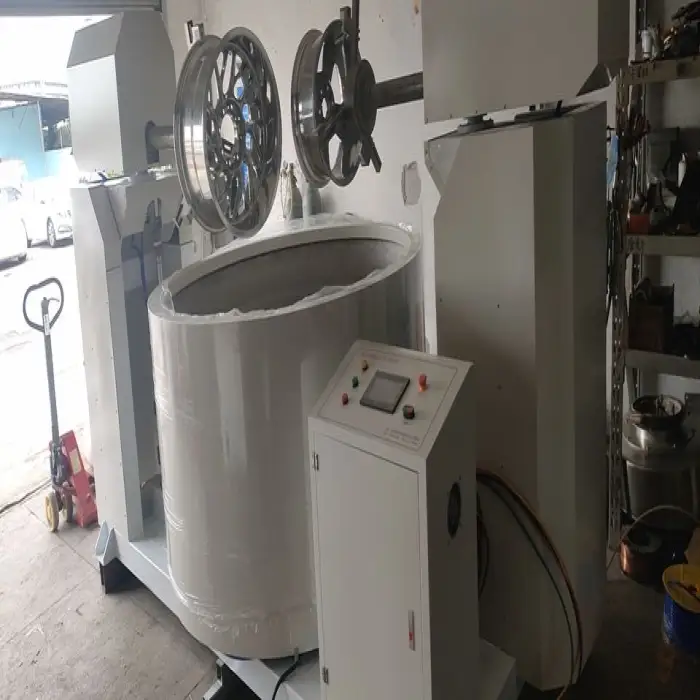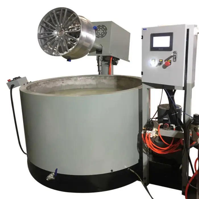 The machine is designed for wheel rim polishing, finishing, deburring, and rust removal.