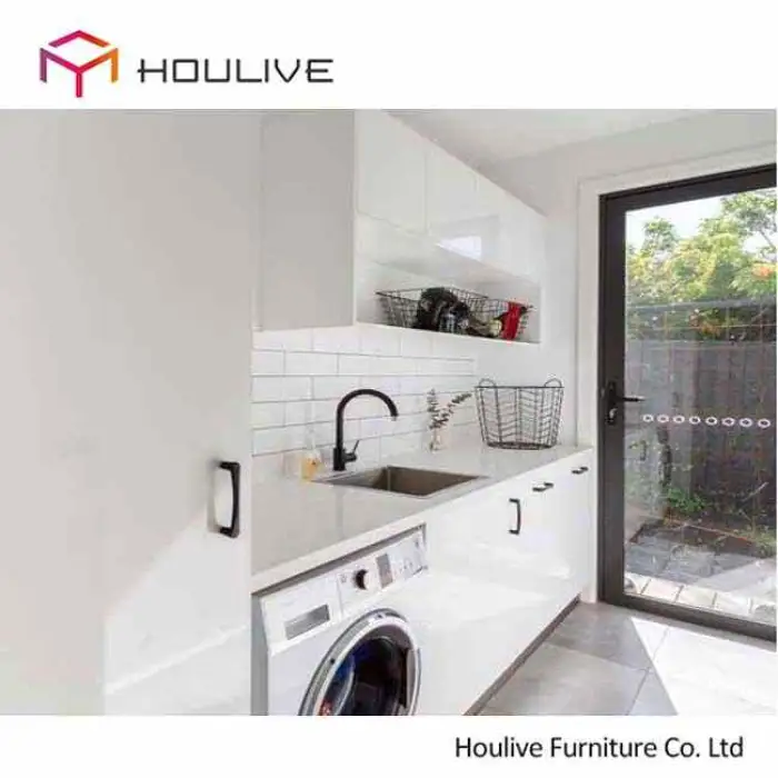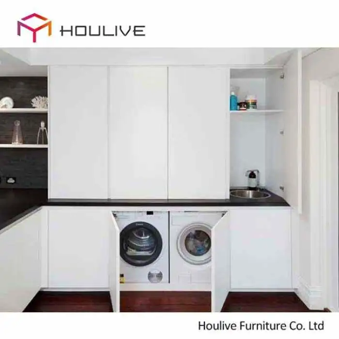 Key features include a modern European design, customizable options, a high gloss finish, and convenient storage for laundry essentials.