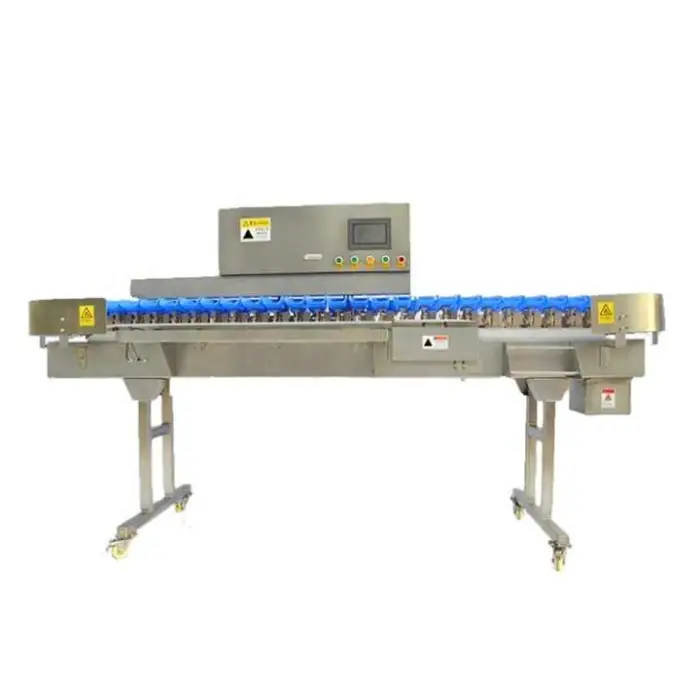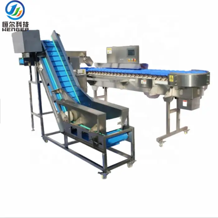 The automatic weight sorting machine is constructed from robust stainless steel, ensuring durability and hygiene in food processing.