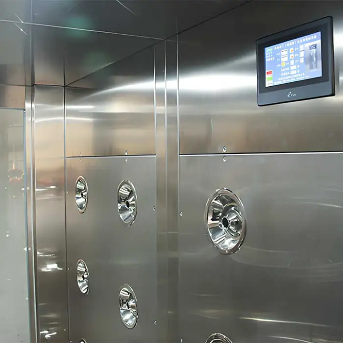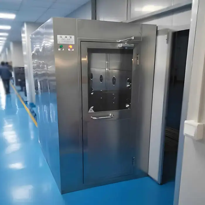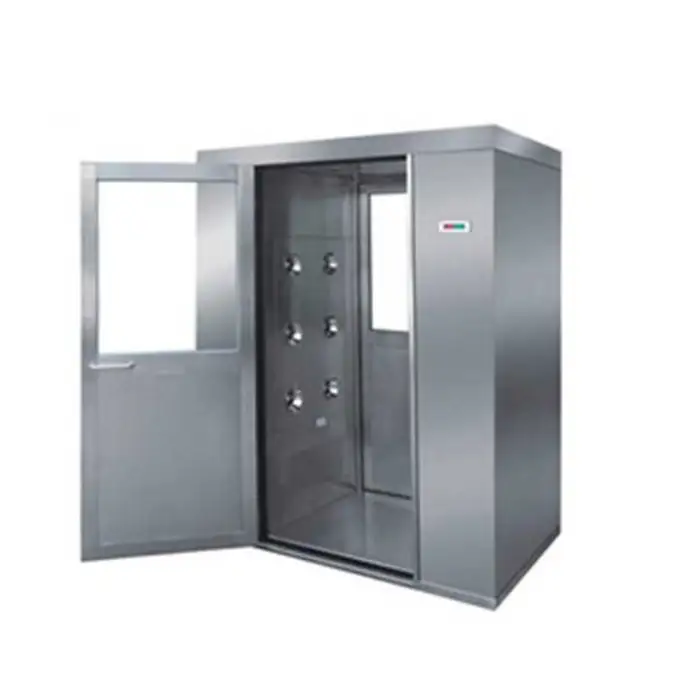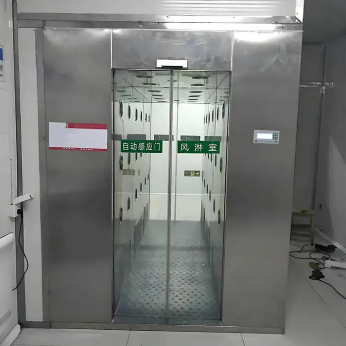 The air shower features an automatic sensor door that allows for hands-free operation.
