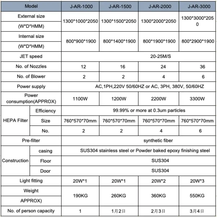 The air shower has a power consumption of 750W, which can be configured for different operational settings.
