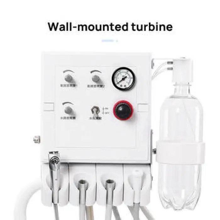 The product description highlights a portable turbine feature for efficient dental work. Inclusion of a specific turbine handpiece or accessories can vary by listing—confirm with the seller whether a turbine handpiece and hoses/couplings are included or sold separately.
