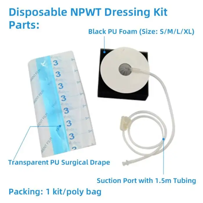 The NPWT Dressing Kit includes all necessary components to effectively manage wound care, ensuring you have everything needed for treatment.
