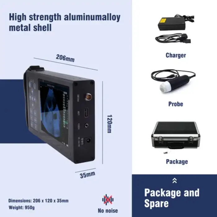 The dimensions of the ultrasound machine are 206mm x 120mm x 35mm.
