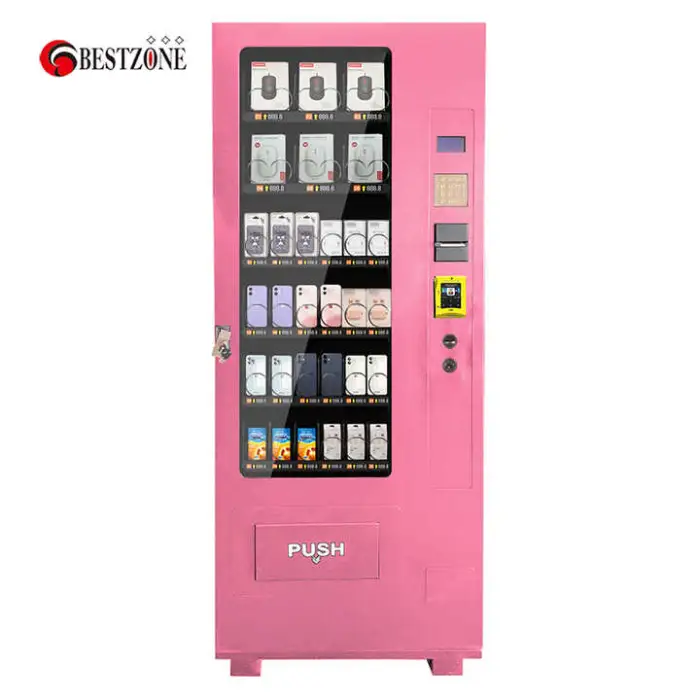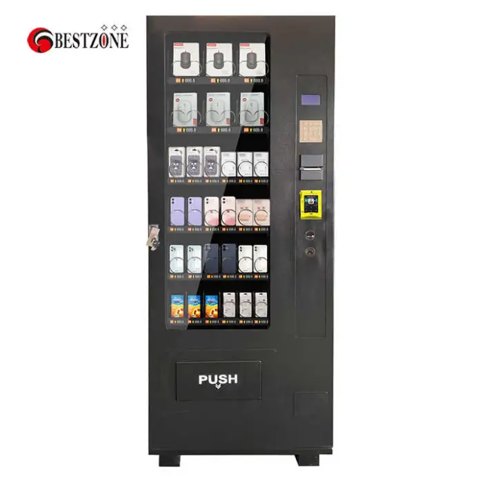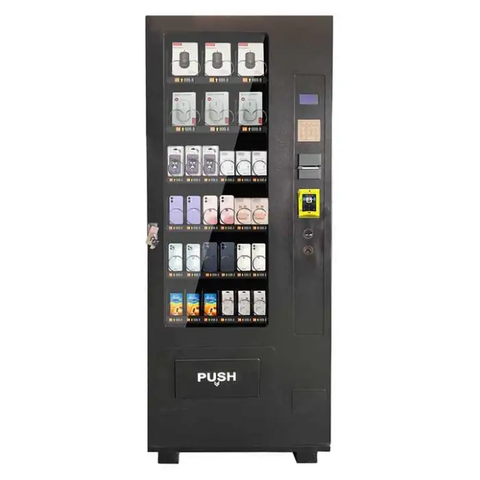 The machine can dispense a variety of snacks and drinks, accommodating different preferences.