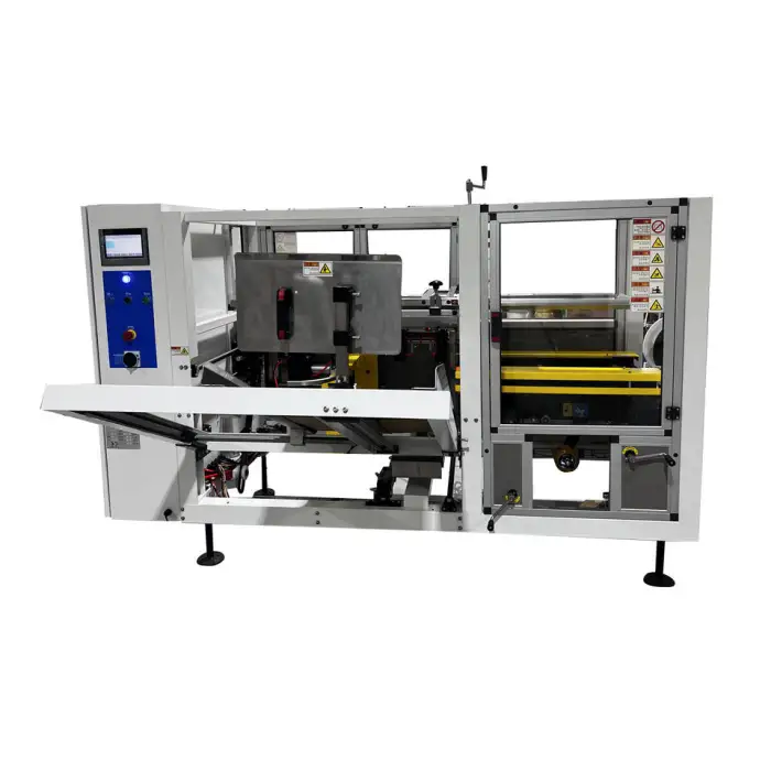 The Melt Glue Case Erector utilizes heat sealing technology for secure closures of cartons.
