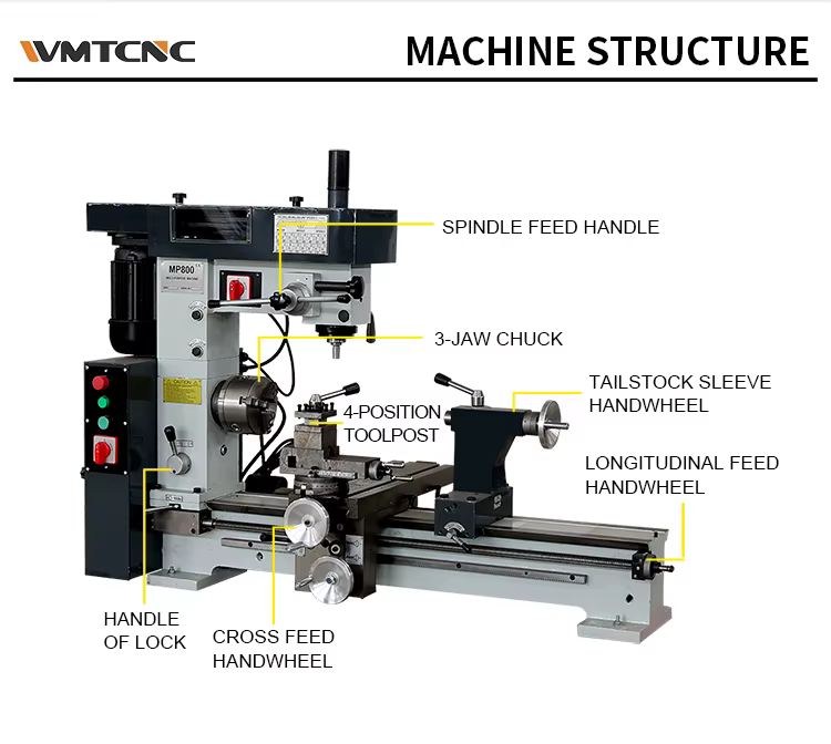 The MP800 is a 3 in 1 machine that combines lathe turning, milling, and drilling functionalities, making it a versatile tool for various metalworking projects.