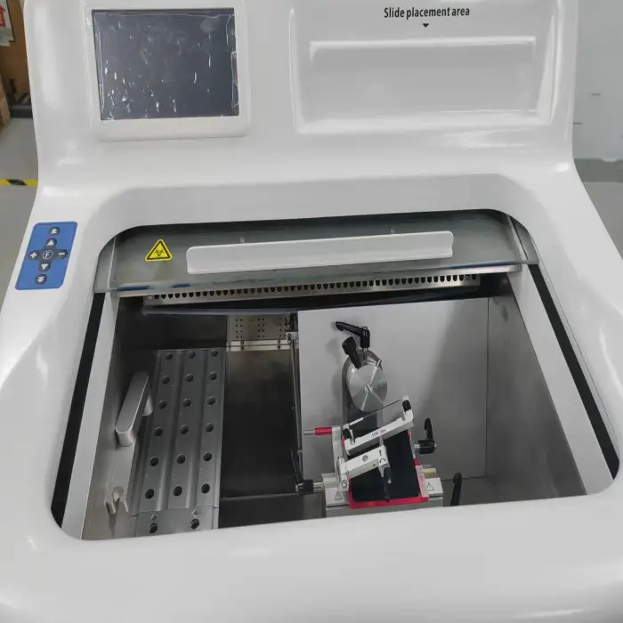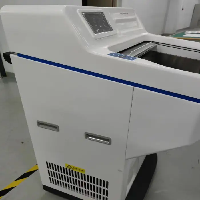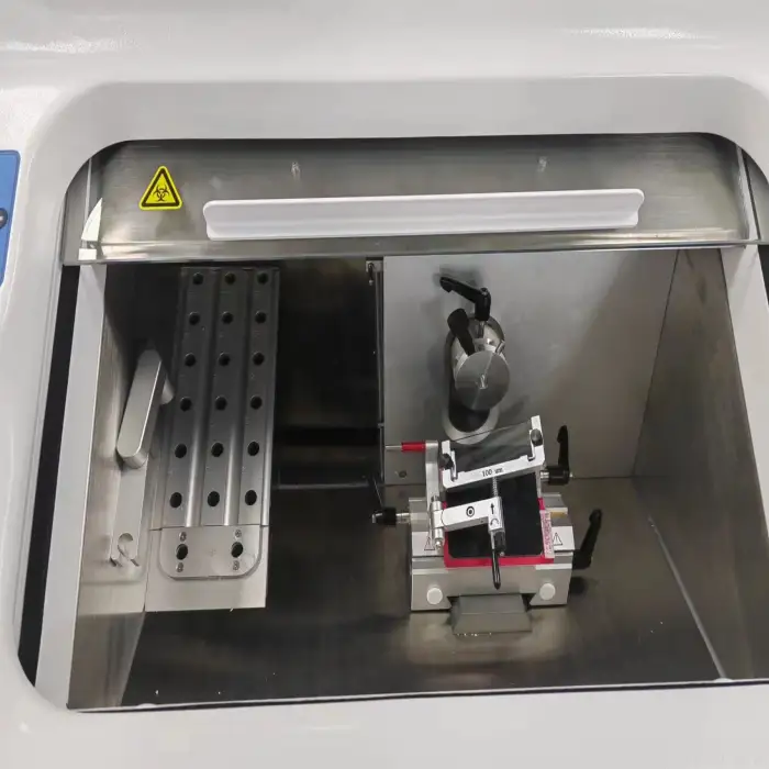 Regularly clean the chamber, waste tray and blade area after use according to lab protocols. Run periodic defrost cycles as recommended, inspect blade clamps and guide rails, and arrange annual preventive service by qualified technicians. Replace refrigerant or major components only by authorized service personnel.
