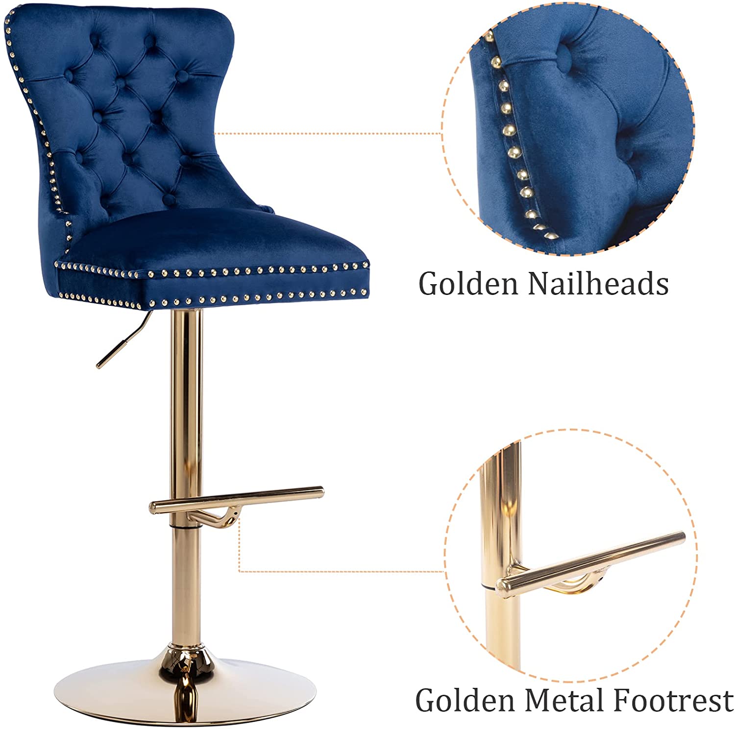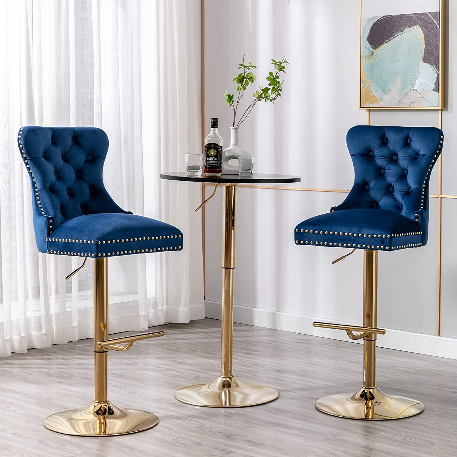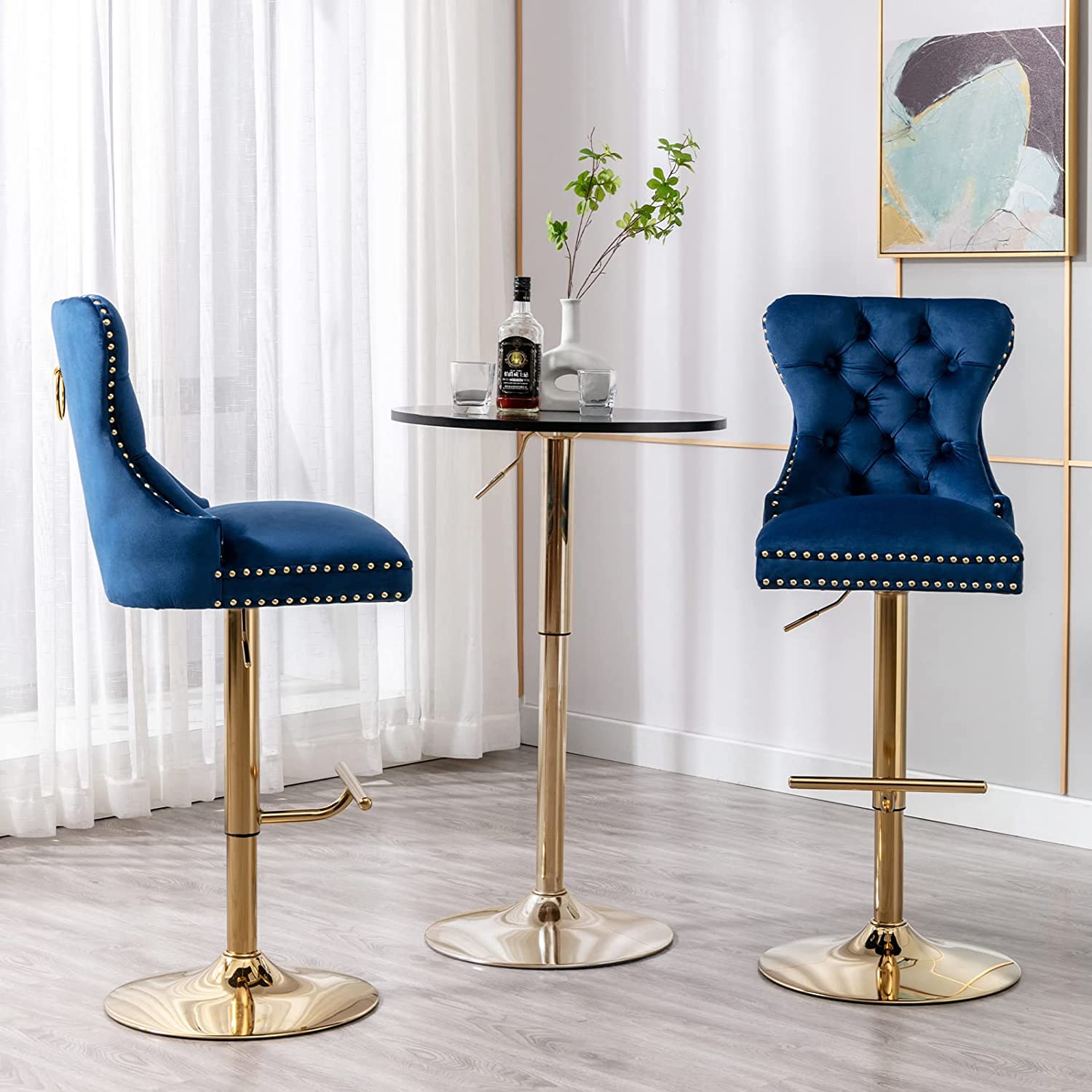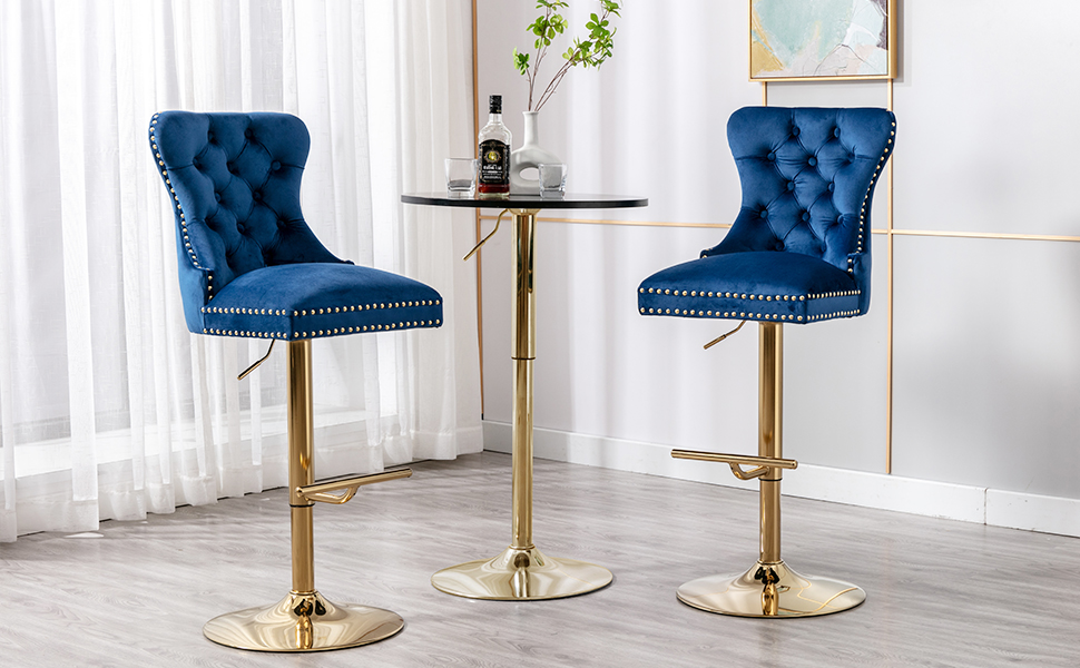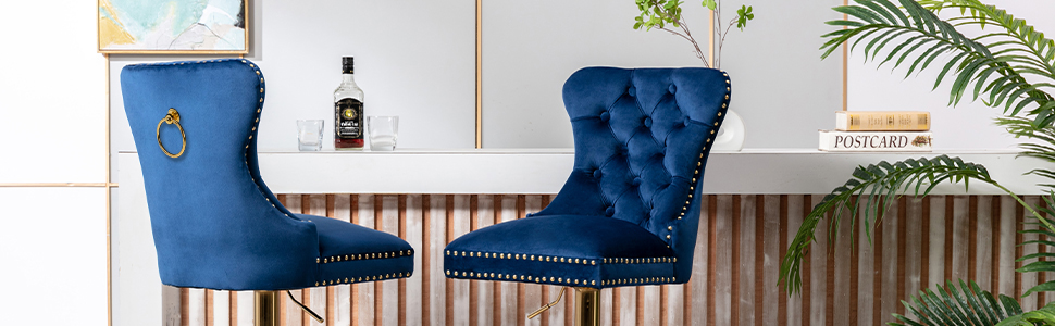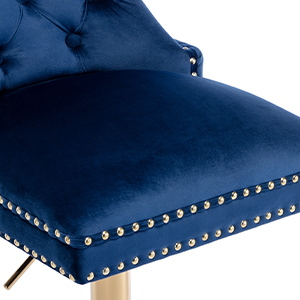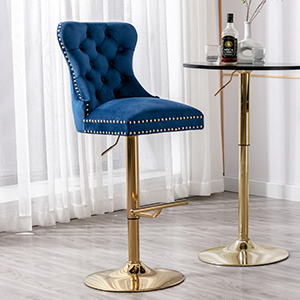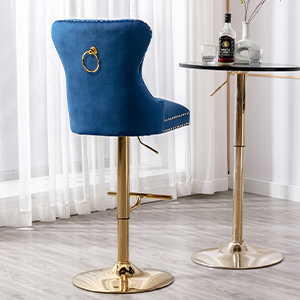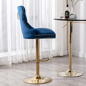 The bar stool is made of high-quality velvet fabric for the upholstery, with a strong metal base for durability.