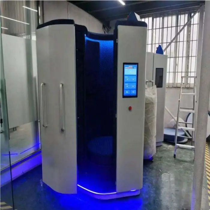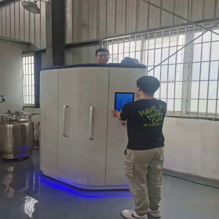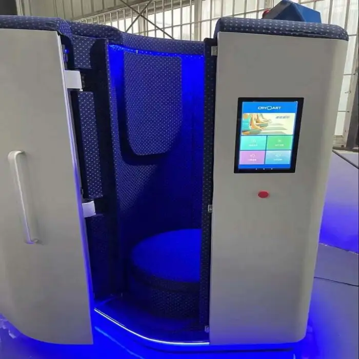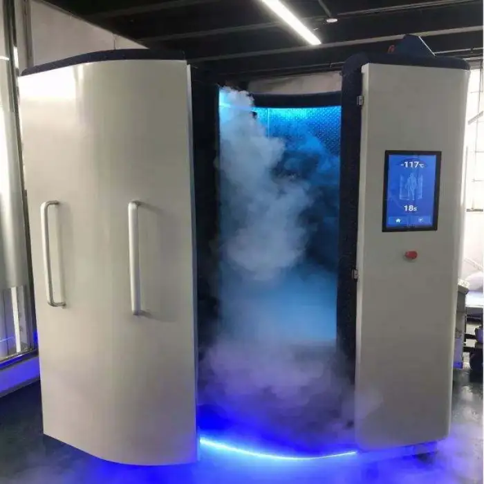 The cryosauna cabin utilizes liquid nitrogen to create the ultra-low temperatures necessary for cryotherapy.